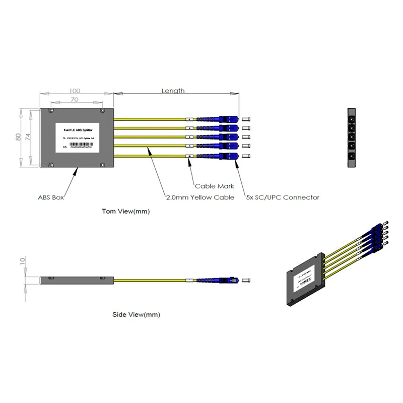 1x4 Planar Pacáiste Ciorcaid Ciorcaid Lightwave Pacáiste 100x80x10mm, φ2.0 Fad Cábla PVC Buí 2.0 +0.1/-0M, Ceanglóir 5pcs SC/UPC.